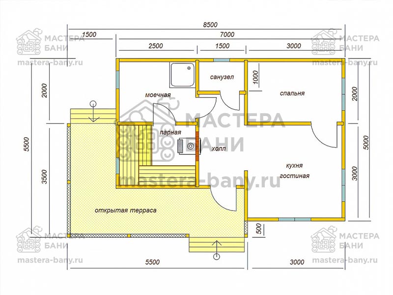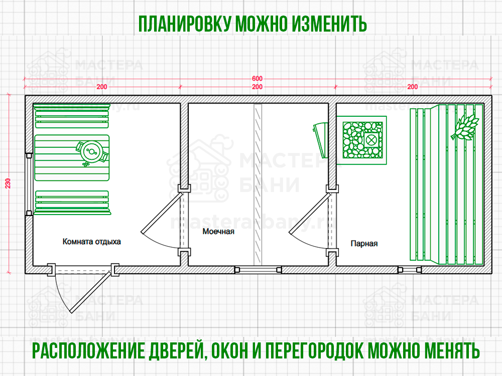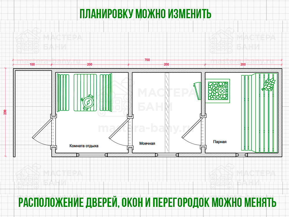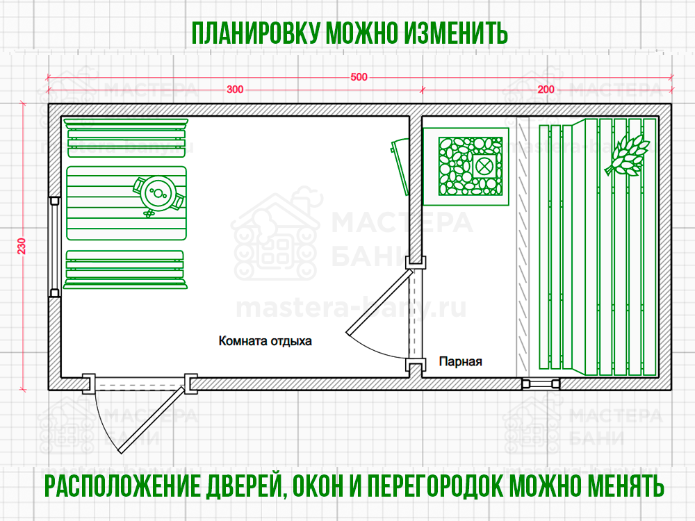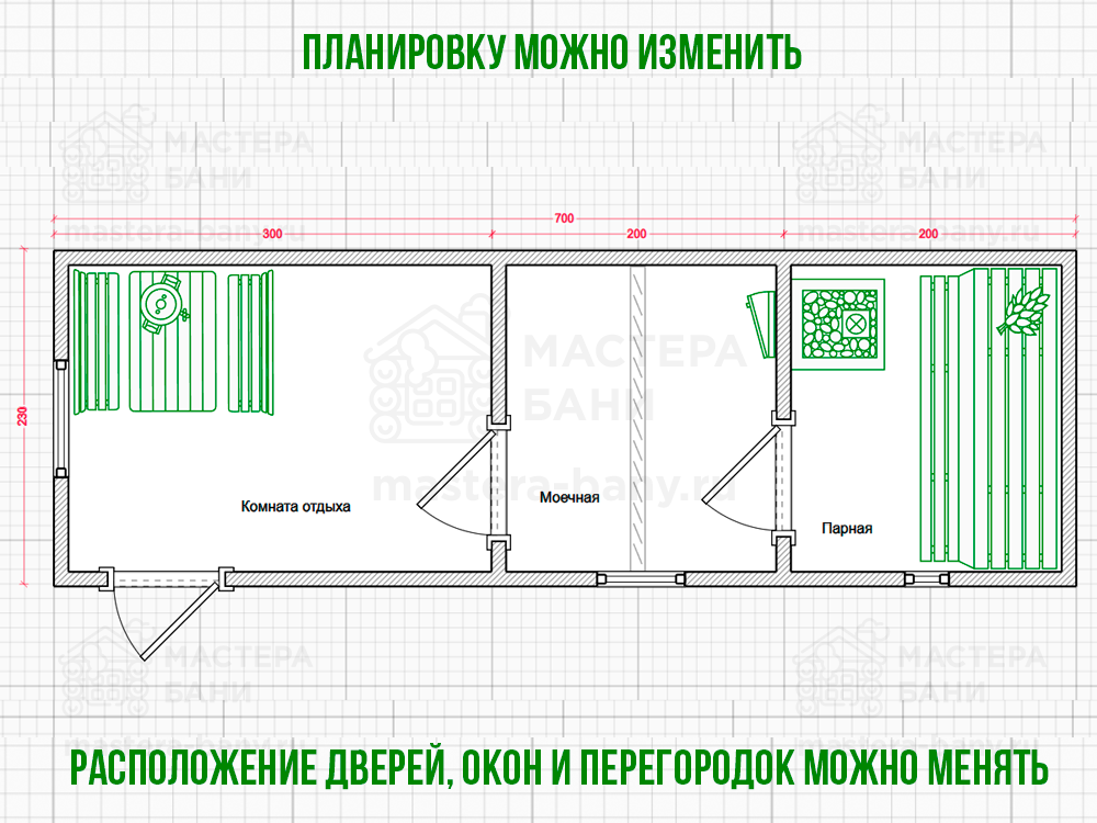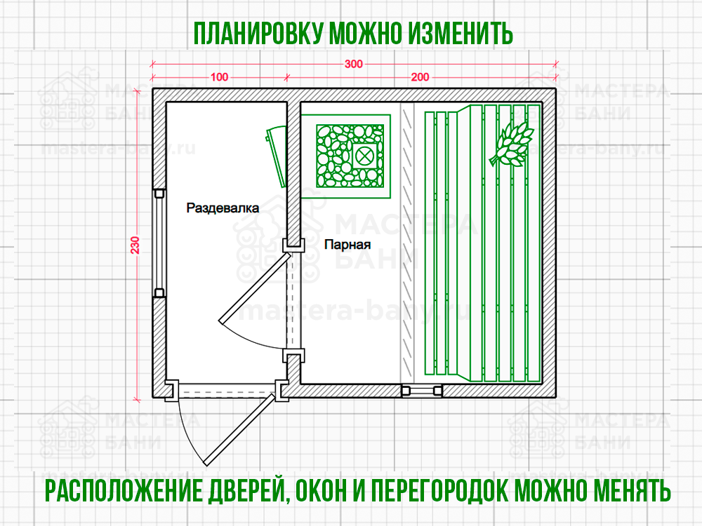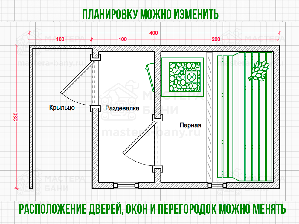 Возможны любые изменения в любом проекте, который размещен на сайте. Также вы можете прислать нам ваш план или проект. Любую баню можно сделать из бруса или по каркасной технологии.